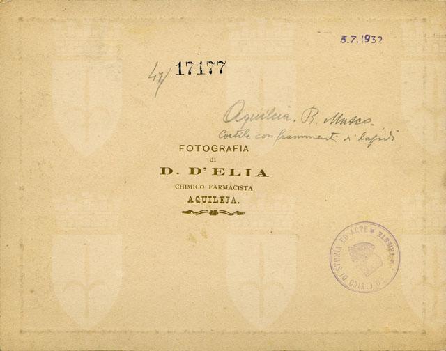Cortile del Museo di Aquileia nella sistemazione di fine Ottocento - inizio Novecento. In primo piano una panchina realizzata con pezzi modanati di reimpiego accuratamente sovrapposti. Sullo sfondo vi sono numerosi reperti lapidei fittamente accostati e addossati al muro di cinta del museo. Si scorgono rilievi a ornato vegetale e figurato, frammenti di lapidi funerarie, elementi decorativi modanati, forse alcuni pertinenti a trabeazioni di edifici, pezzi di statue, frammenti di colonne e capitelli, ecc.