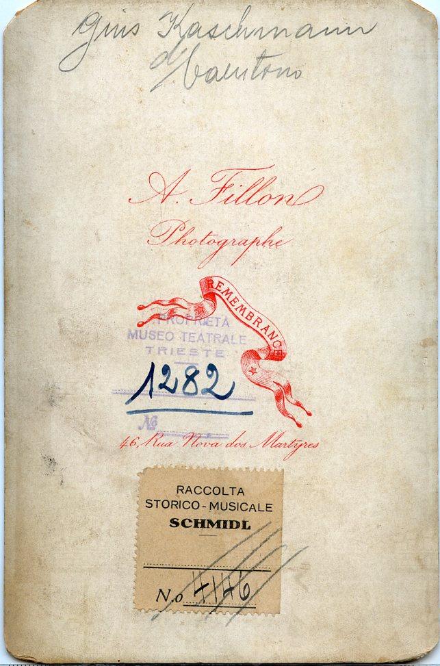 In costume, nell'opera "Ruy Blas" (vedi nota ms.) o in "Hamlet" (confronto con inv. 1282A, 1283). A Trieste si è esibito al Teatro Comunale nel 1877 in "Gli Ugonotti", nel 1908, nel ruolo del titolo, "Il Battista", e nel 1912 in "Don Pasquale" e "L'elisir d'amore"; nel 1910 al Politeama Rossetti nel ruolo di Scarpia nella "Tosca"