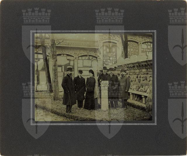 Il Curatorio del Museo di Storia ed Arte in posa nell'Orto Lapidario. L'iscrizione apposta sul retro della foto permette di identificare, da sinistra, Francesco Basilio, Giovanni da Scaramangà, la baronessa Nina Morpurgo, il professore Alberto Puschi, direttore del Museo di Storia ed Arte, l'architetto Enrico Nordio e il professore Piero Sticotti, conservatore del Civico Museo di Storia ed Arte.