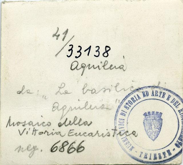 Particolare del mosaico che orna l'aula sud della Basilica teodoriana di Aquileia. Il dettaglio si riferisce al pannello musivo posto al centro dell'aula, in prossimità del noto tessellato con la vicenda del profeta Giona, caratterizzato da una composizione ortogonale di ottagoni e di rettangoli adiacenti, formanti piccoli ottagoni irregolari. Lo schema è interrotto al centro da un riquadro campito dalla raffigurazione di una Vittoria alata, visibile nella fotografia, che trattiene nelle mani una corona e un ramo di palma; ai suoi piedi vi sono un cesto colmo di pani e un altro recipiente che un restauro antico realizzato in tessere bianche non permette di identificare. Il pavimento si data al secondo decennio del IV sec. d.C.