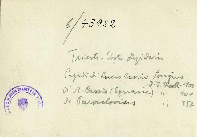 Lapidi romane murate nell'Orto Lapidario del Museo civico di Storia ed Arte di Trieste. La lastra posizionata in alto a sinistra reca l'iscrizione: [---] Equasia [---] M(arcus) Cassi[us ---]. L'epigrafe sottostante recita: [F]laccia (mulieris)) l(iberta) Mosch[is], h(ic) s(ita) e(st). [L(ocus)] m(onumenti) in agr(um) p(edes) [---], in f(ronte) [p(edes) ---]. La centrale porta l'iscrizione: L(ucius) Cassius Longini l(ibertus) Phoebus/ph(ic) s(itus) e(st). In quella di destra, invece, si legge: P(ublius) Araclovi[us] Tertiae, uxori suae, [a]n(norum) LXV, testam(e)nto [fier]i iussit.