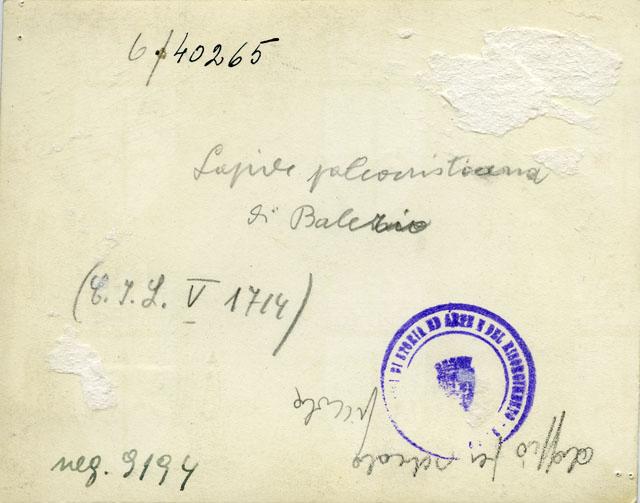 Lapide cristiana rinvenuta ad Aquileia presso la Beligna. La lapide apparteneva alla collezione del facoltoso farmacista triestino Vincenzo Zandonati che fu acquistata dal Comune di Trieste nel 1870 e andò a costituire il primo nucleo del nascente Museo Civico di Storia ed Arte della città. La lapide, ricomposta con due frammenti, conserva parte dell'iscrizione originaria, che recita: [---]io filio Balerio [qui vixi]t anos XVIII, men(ses) V d(ies) [--- qu]i discessit Cristi [servus] mater Simplicia con= tra votum posuit qu(e)sque in pace et puella nomine Malisa. Il testo dell'iscrizione è interrotto dalla raffigurazione di un uomo e di una donna, ritratta nella posizione dell'orante, stanti sotto un'architettura definita da due colonne che sorreggono un arco a cui sono appesi tendaggi. Tra le figure vi è l'immagine di una colomba, sopra l'architettura campeggia il cristogramma tra rami di palma. L'iscrizione si data nella seconda metà del IV sec. d.C.