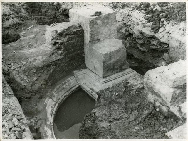 Scavo del teatro romano di Trieste./pLa foto inquadra il particolare del muro del frontescena nel tratto corrispondente all'apertura centrale, la porta regia, che si apriva sulla destra del pilastro. Lo scavo ha messo in luce la porzione inferiore del fondale scenico caratterizzato da un profilo a nicchie definito da una base marmorea modanata sui cui si imposta un nucleo interno in muratura. La buona conservazione dei resti ha consentito la ricostruzione pressoché completa del frontescena: al centro vi era un'esedra semicircolare dove si apriva la valva regia mentre ai lati trovavano posto due esedre rettangolari all'interno delle quali vi erano altre due aperture, le valvae hospitales. All'interno delle esedre, ai lati delle porte, erano collocate delle basi che forse sostenevano colonne posizionate ai lati degli accessi. Erano probabilmente destinate a impreziosire il frontescena le state rinvenute nel corso dello scavo, molte delle quali trovate proprio davanti alla scena, nell'iposcenio.