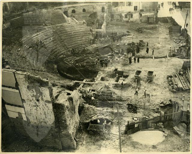 Il teatro romano in corso di scavo visto da sud-est./pLa foto documenta il procedere del cantiere: del monumento è stato individuato il muro perimetrale, che si conserva per ampi tratti in elevato, e la maggior parte della gradinata della cavea, in corrispondenza della quale continuano le operazioni di scavo. Lo sbancamento procede anche sull'orchestra, dove si sta lavorando per raggiungere il piano di fondo. Davanti all'orchestra l'interro moderno copre ancora la zona della scena, di cui è stato intercettato solo qualche elemento del muro di fondo.