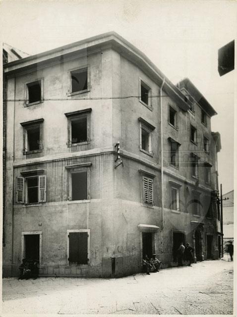 Edificio di contrada del Pozzo Bianco di proprietà di Bonomo Pietro Cristoforo, commissario di guerra alla marina. Sopra il portone al civico 12 si vede lo stemma della famiglia ascritta nelle tredici nobili casate di Trieste.
