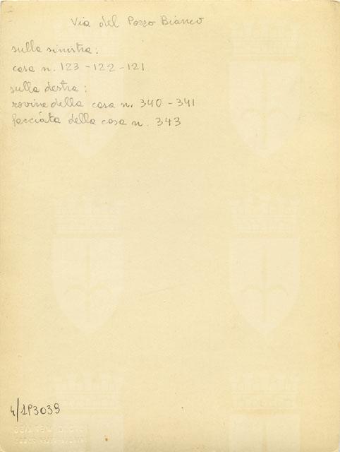 Via del Pozzo Bianco in Cittavecchia durante le demolizioni previste dal piano urbanistico fascista. Sulla sinistra le case ai civici nn. 123-122-121, sulla destra i resti della casa nn. 340-341 e la facciata della casa n. 343.