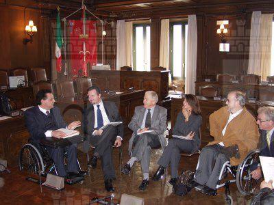 L'assessore comunale Claudia D'Ambrosio, il presidente del Consiglio comunale Bruno Sulli ed il Vicepresidente del Consiglio regionale del FVG Giulio Staffieri, durante l'incontro con il presidente Giuseppe Trieste ed altri rappresentanti del Fondo Italiano Abbattimento Barriere Architettoniche ,