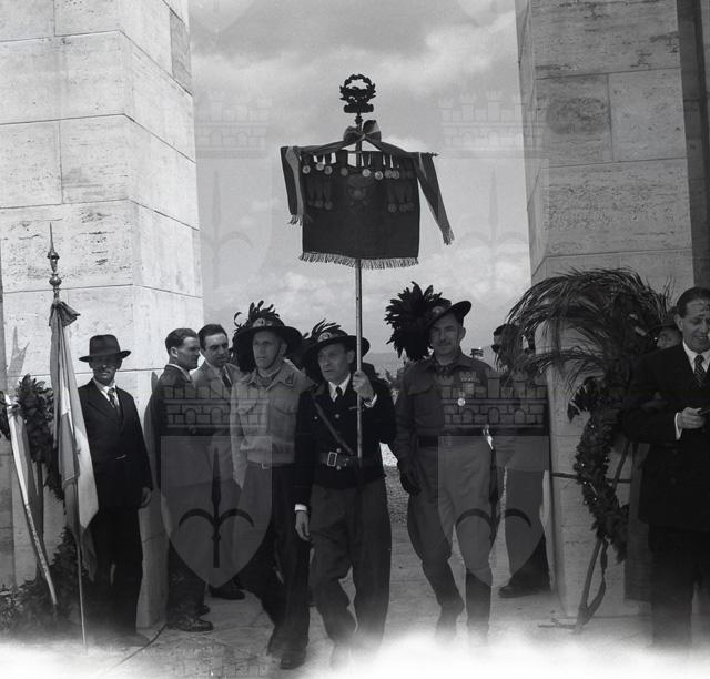 Folla presenzia alla cerimonia di inaugurazione dell'Ara Pacis Mundi di Medea. Cartellone sul muro di una casa: Sottocentro fecondazione artificiale. Uomo al volante di un'automobile