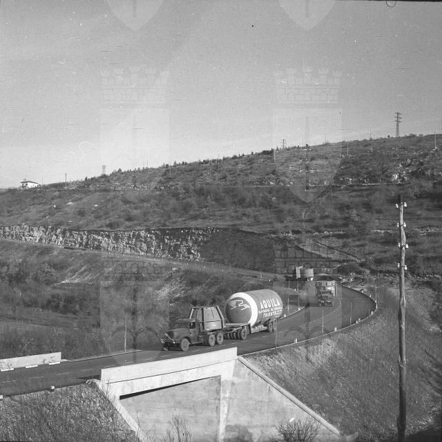 Tre camion rimorchio, giunti da Crema, trasportano un grande serbatoio destinato alla Raffineria Aquila. Il vuoto e' composto da un primo elemento lungo m 7,5 e del diametro di m 3,80, peso circa 20 tonnellate, e da un altro elemento analogo e della struttura metallica del forno. E' il primo impianto del genere costruito in Italia, su disegno di una ditta di Boston