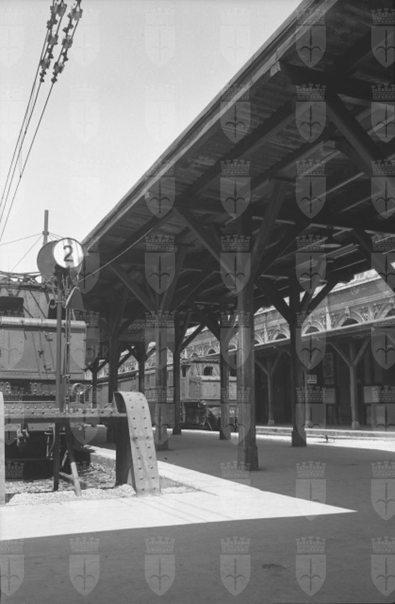 La vecchia pensilina della stazione centrale e la filovia della linea 5 in piazza Goldoni.