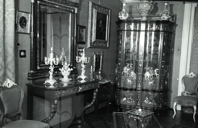 La splendida camera da letto di Draga Obrenovic, regina di Serbia, moglie del re Alessandro, composta da mobili olandesi intarsiati d'avorio. Draga e Alessandro, convolati a nozze nel 1900, furono assassinati la notte del 10 giugno 1903, proprio in questo letto: una congiura di palazzo pose fine alla dinastia degli Obrenovic, per insediare sul trono Pietro Karageorgevic. La camera appartenne a una nobile famiglia triestina e fu poi venduta a un celebre antiquario che la riallesti in una villa di viale Terza Armata, dove fu fotografata.