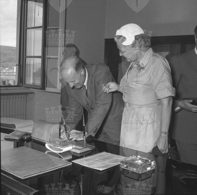 Il capo della Divisione dell'Industria della M.S.A. (Mutual Security Agency) di Roma, mr. Andrew Carey, giunto a Trieste in occasione della giornata della M.S.A. organizzata nell'ambito della manifestazioni della Fiera campionaria, visita la Raffineria Aquila, il Cotonificio San Giusto e il cantiere San Marco (da: Giornale di Trieste, 13 luglio 1953)