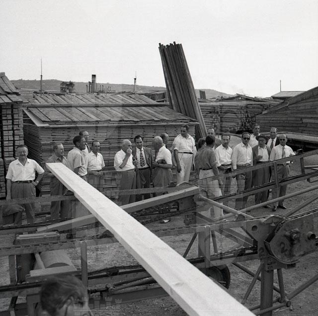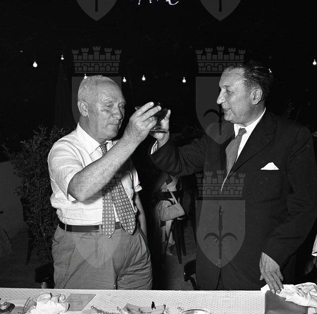 Visita dello stand della S.A. Forestale, lavorazione legnami. Gruppo di persone a cena