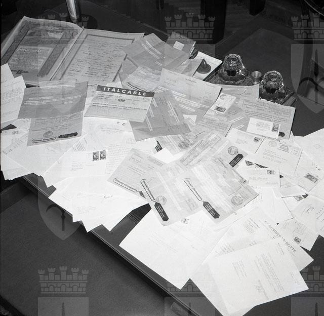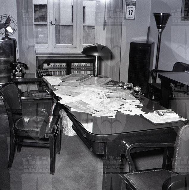 Documenti di lavoro sparpagliati su una scrivania. Gruppo di impiegati in posa all'interno di un ufficio. Pergamena celebrativa per il 40. di lavoro del direttore