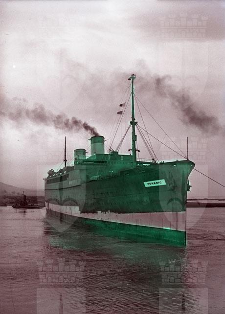 La motonave Homeric entra, trainata da rimorchiatori, nel porto di Monfalcone.Magnifico piroscafo di 18.563 tonnellate, venne costruito nel 1931 per la Matson Line con il nome Mariposa. Nel 1953 la Home Lines lo compro' e rinomino' Homeric adibendolo a trasporto passeggeri per il Centro e Sud America. Nel 1974, a causa di un incendio sofferto l'anno precedente, venne smantellato.