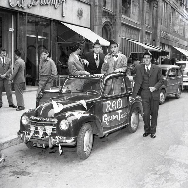 A bordo di una Giardinetta, quattro goliardi dell'Ateneo barese (Sandro e Piero De Riccardis, Giacomo Viva ed Enzo Caglio) hanno compiuto il raid Galatina, Napoli, Roma, Siena, Firenze, Bologna, Padova, Trieste. Tratto da Il Piccolo, 12-13 aprile 1955