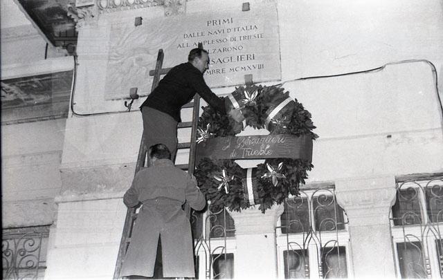 Deposizione di corone della Associazione Nazionale Bersaglieri, sezione Enrico Toti di Trieste, sotto la targa che ricorda lo sbarco, dall'incrociatore Audace, dei bersaglieri a Trieste il 3 novembre 1918