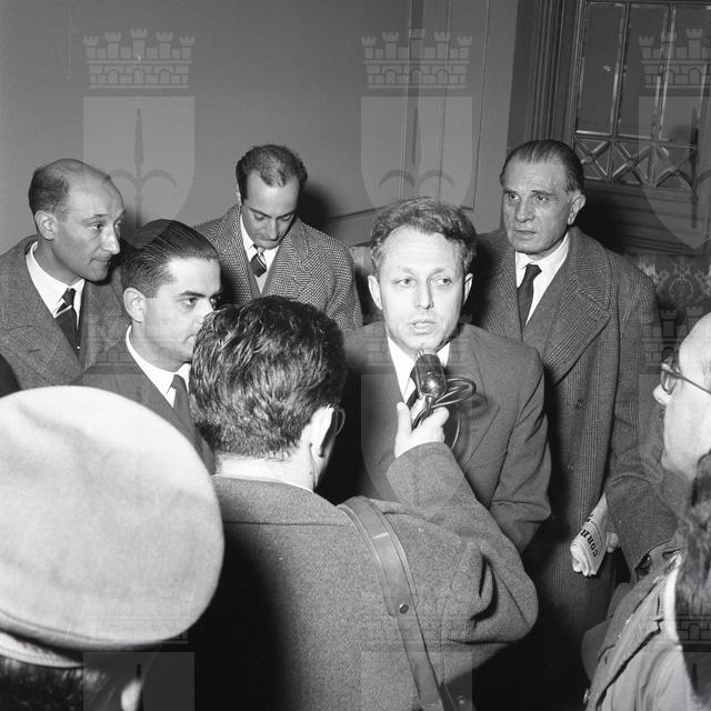 Mario Martinelli (Como, 12 maggio 1906 - 21 maggio 2001), senatore della Repubblica, deputato della Costituente, per sei volte ministro, fu esponente del Partito Popolare prima e della Democrazia Cristiana in seguito. Nel servizio fotografico Martinelli, ministro del Commercio con l'estero, viene accolto a Trieste dal sindaco Bartoli, reduce da una missione effettuata a Belgrado il 7 e 8 dicembre 1954. Questa missione, in cui si incontrò col vicepresidente jugoslavo Kardely (il maresciallo Tito era in missione di Stato in India), determinò un'autentica svolta nelle relazioni fra Italia e Jugoslavia che si concretizzò nell'accordo per la stipula di un nuovo trattato commerciale