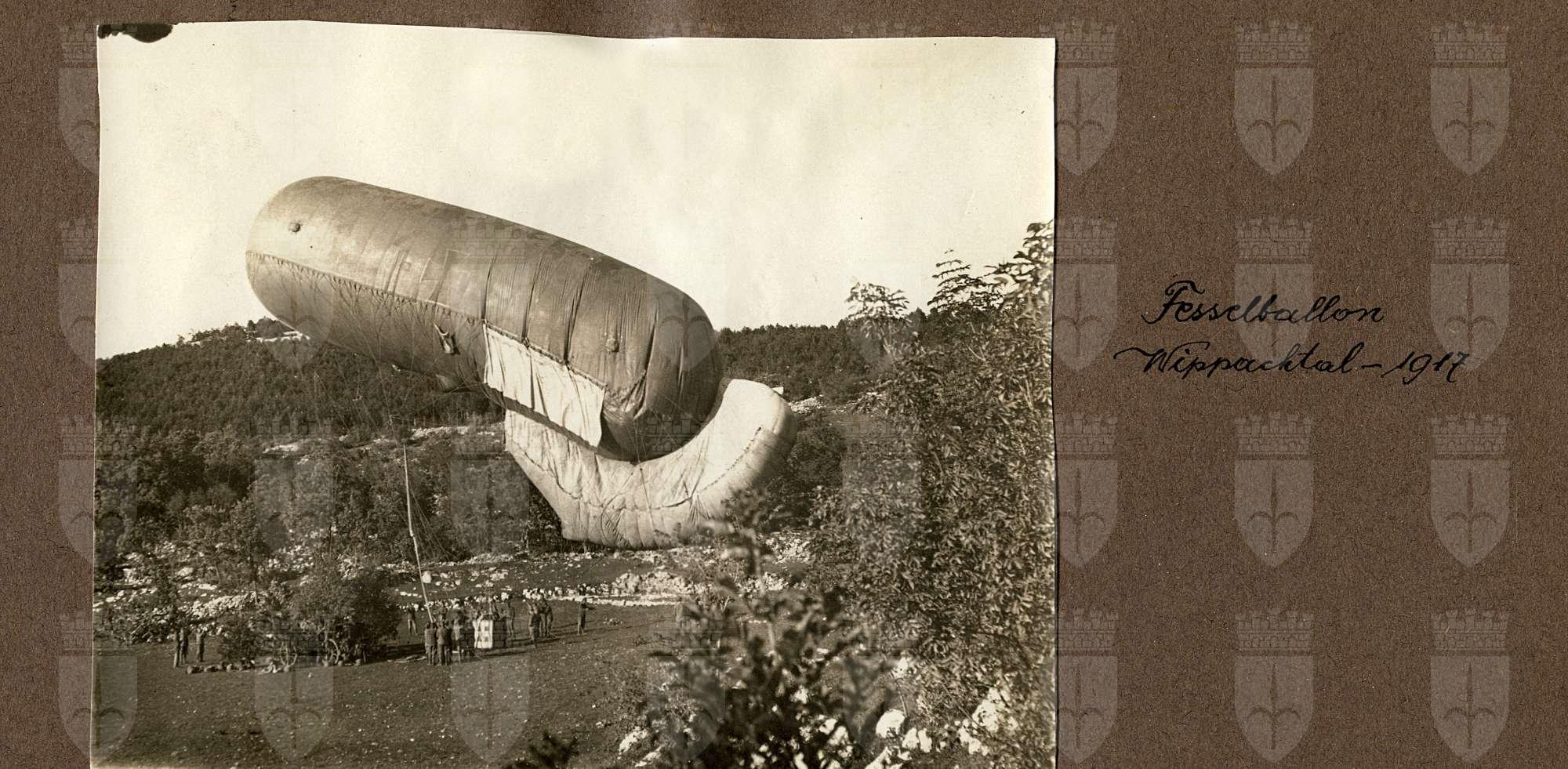 Pallone di osservazione frenato da cavi nella valle del Vipacco 1917