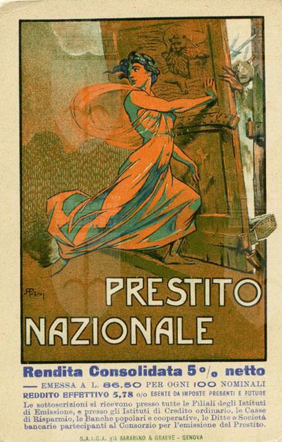 Una particolare campagna pubblicitaria fu realizzata in occasione del Prestito nazionale, per far fronte alle spese di guerra. Numerosi pittori, illustratori, pubblicitari furono ingaggiati per realizzare opere grafiche basate su un medesimo tema iconografico, ossia la difesa della Patria mediante il sacrificio comune. Furono quindi protagonisti di queste opere i soldati feriti o bisognosi di armi che chiedevano aiuto a quanti rimasti a casa. Non mancarono comunque le immagini di bambini, anziani genitori e donne, alle quali veniva affidato un ruolo fondamentale nella campagna di sensibilizzazione e condizionamento delle coscienze. L’Italia fu inondata, soprattutto a partire dal III Prestito del gennaio 1916 per culminare con il IV dell’anno dopo, da francobolli, calendari, cartoline postali illustrate, opuscoli, volantini, locandine, manifesti, fino ai veri e propri arredamenti urbani . La propaganda per il Prestito ottenne così il doppio scopo di essere suggestiva, smuovendo le coscienze, e raggiungere un gran numero di persone.