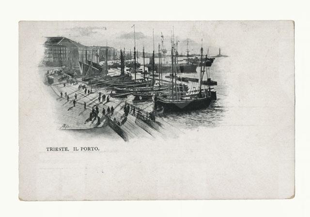 Alcune delle cartoline più antiche conservate in Fototeca (utilizzate in viaggio e non) propongono il tema del porto in forma di veduta con elementi decorativi, spesso floreali, affiancati dalla dicitura “Saluti da Trieste”. Il modello riprende lo stile dei Gruss tedeschi, con una struttura compositiva che contempla la piccola veduta racchiusa in cammei per lasciare lo spazio al messaggio, sul recto in basso a destra, in modo da non sporcare l'immagine. Il verso è originariamente destinato solo all'indirizzo e al francobollo. Testo tratto dal saggio: "Vedute e visioni di Porto Vecchio"