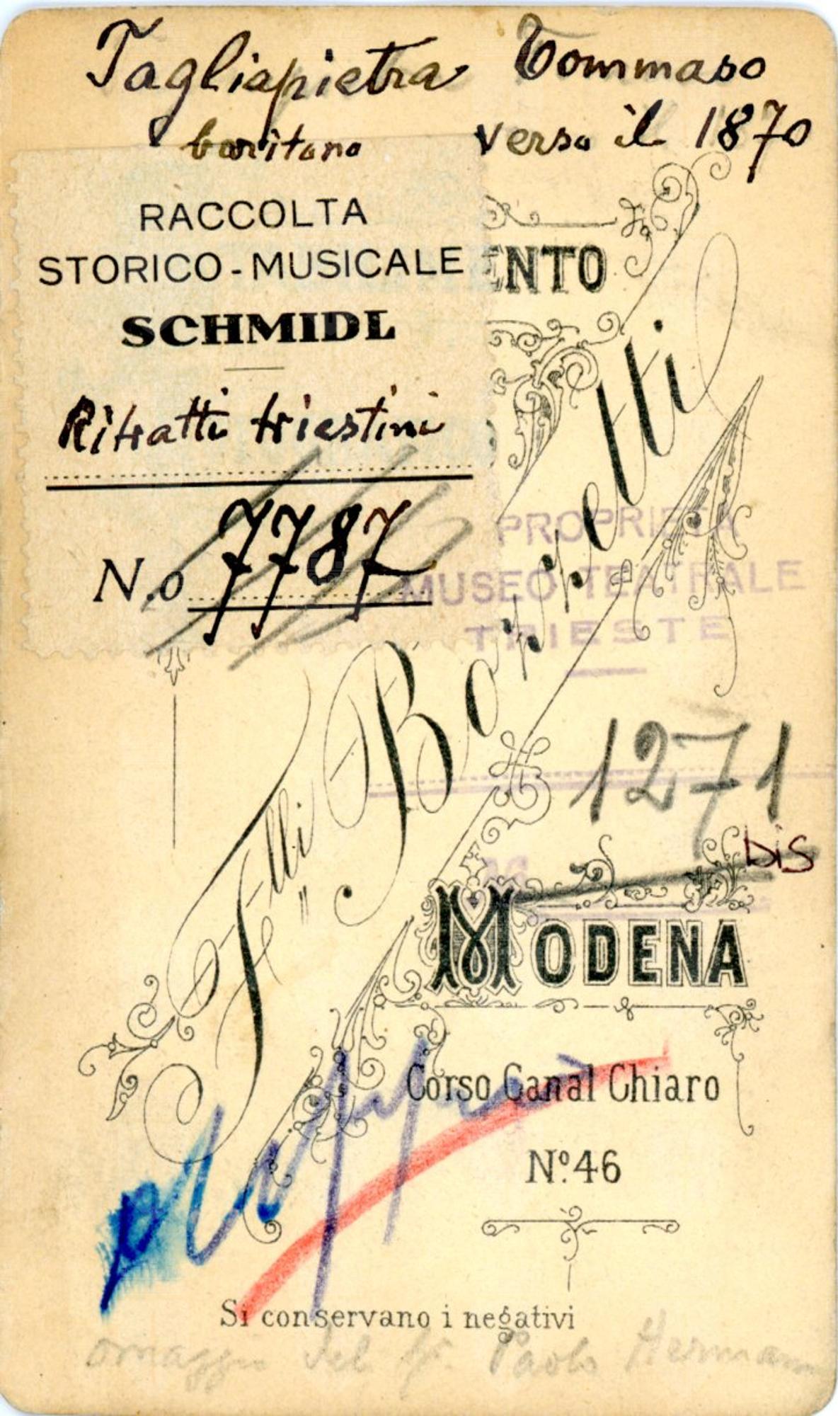 In costume nel ruolo di Alfonso in "La favorita", interpretata anche a Vigevano e Zara nel 1872; nel 1875-76 a Nizza ha interpretato Laerte in "Mignon" e Valentino nel "Faust; l'anno successivo Nevers, negli "Ugonotti" a Genova. A Trieste ha partecipato al concerto del 31.3.1872 diretto da Giuseppe Rota al Teatro Comunale