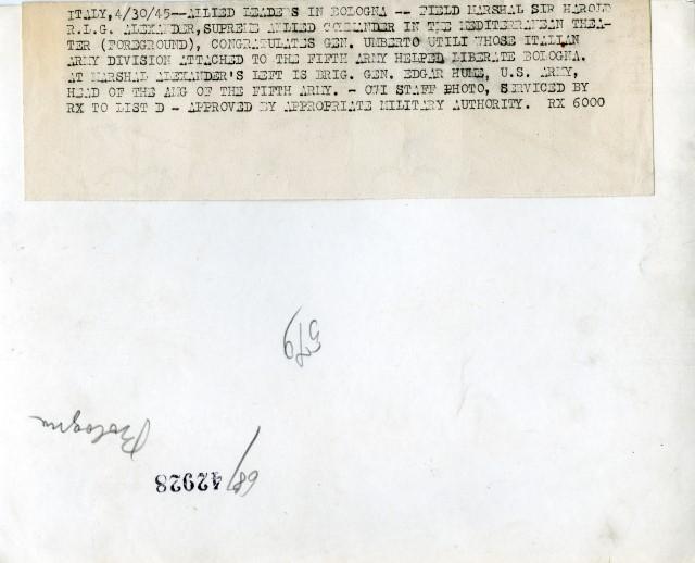 Umberto Utili (1895-1952) è stato un generale di divisione, comandante del Corpo Italiano di Liberazione durante la seconda guerra mondiale. Figlio di un ufficiale di fanteria, partecipa come tenente del 17° artiglieria al primo conflitto mondiale, quindi come tenente colonnello comandante d’artiglieria nella 1ª divisione eritrea nella guerra in Africa orientale nel 1936 in cui fu decorato al valore militare nella battaglia di Mai Ceu. Nel secondo conflitto mondiale è impegnato nel 1940 come colonnello al comando d’artiglieria del XXVI C.A. nella campagna di Grecia e sul fronte russo con lo C.S.I.R. nello stato maggiore del generale Giovanni Messe, l’8 settembre si trova in Puglia, quando le truppe alleate cominciano l’avanzata verso nord. A fine gennaio 1944 subentrò al generale Vincenzo Dapino al comando del Primo Raggruppamento Motorizzato che sotto il suo comando viene trasformato nel Corpo Italiano di Liberazione, alle dipendenze dell’8ª Armata britannica. Dopo le battaglie dei primi mesi del 1944 il generale Utili propone agli alleati un potenziamento delle forze italiane, gli alleati accettano e l’organico viene portato a 25.000 uomini suddiviso in gruppi di combattimento, Utili comandò il Legnano fino alla conclusione del conflitto. Nell’immediato dopo guerra comandò il 3° Corpo d’Armata di Milano. Morto nel 1952, è sepolto nel cimitero militare di Mignano Monte Lungo, dove sono state raccolte 975 caduti durante la guerra di liberazione. Testo tratto dal sito https://www.combattentiliberazione.it/corpo-italiano-di-liberazione-c-i-l Feldmaresciallo britannico (contea di Tyrone, Irlanda settentr., 1891-Slough, Londra, 1969). Partecipò alla Prima guerra mondiale, ebbe poi incarichi in India e venne nominato maggior generale (1937). Nella Seconda guerra mondiale comandò (1940) il corpo di spedizione britannico durante la ritirata di Dunkerque; trasferito in Medio Oriente (1942), divenne poi comandante in capo delle forze britanniche nell’Africa settentr. (1943) e, poco dopo, delle forze alleate in Italia; il 28 sett. 1943, insieme al generale Eisenhower, ricevette il maresciallo Badoglio per la firma dell’armistizio «lungo». Ebbe parte decisiva nella condotta della campagna d’Italia: suo il proclama che nel nov. 1944 invitava i partigiani a sospendere le operazioni su vasta scala. Il 26 nov. 1944, promosso maresciallo e divenuto comandante supremo delle forze alleate nel Mediterraneo, prese anche il comando delle operazioni di sbarco nella Francia meridionale. Dal 1946 governatore generale del Canada e visconte, fu anche ministro della Difesa (1952-54). Testo tratto da https://www.treccani.it/enciclopedia/harold-rupert-leofric-george-alexander_(Dizionario-di-Storia)/
