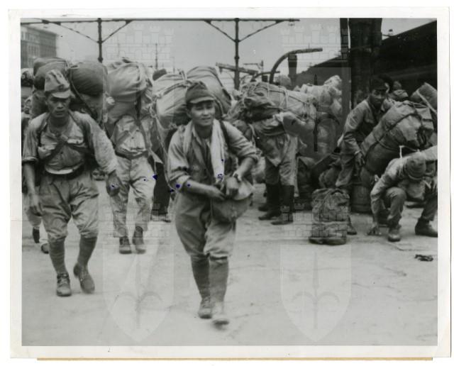 Alcuni soldati giapponesisi trovano alla stazione ferroviaria di Tokyo e sono pronti a tornare a casa, dopo la firma della resa del Giappone del 2 settembre 1945.