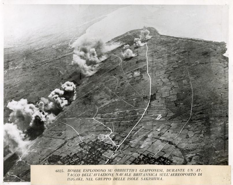 Veduta aerea di un attacco dell'Aviazione britannica sull'aeroporto di Isjigaki, isola del gruppo delle Sakishima, avvenuto nel giugno 1945.