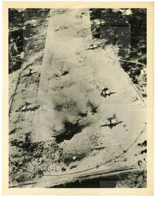 Nell'immagine, ripresa da un aereo, è possibile vedere aerei in fiamme dopo un attacco nemico.