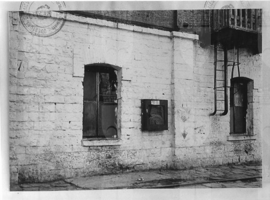 Riproduzione di una fotografia della facciata di un edificio all'interno della Risiera di San Sabba, sul recto il timbro della Polizia, probabile materiale del Gabinetto di Polizia Scientifica della Questura di Trieste