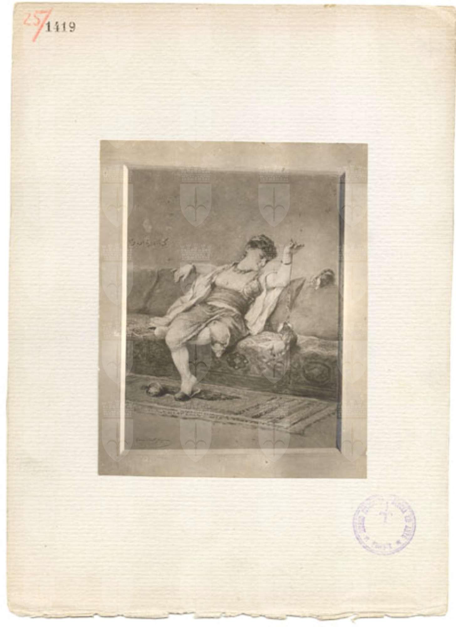 L'acquerello donato al Municipio di Pirano ritrae una Donna in costume orientale che gioca con due scimmiette