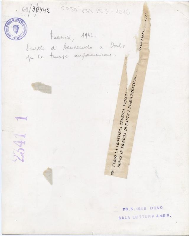 Francia, 1944 : scritte di benvenuto a Doubs per le truppe angloamericane