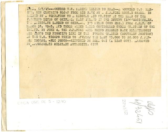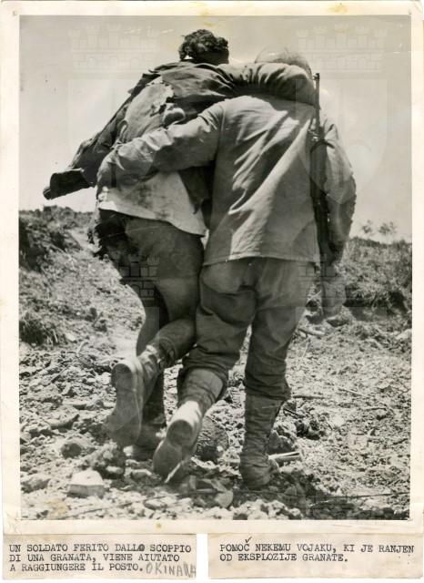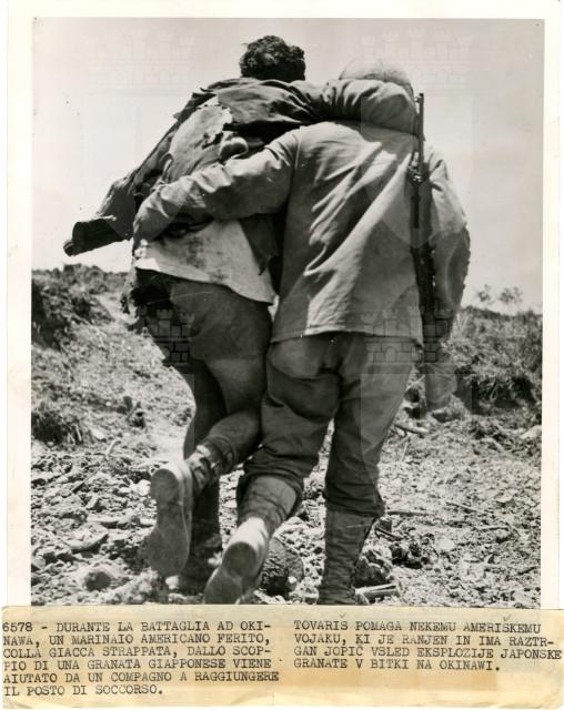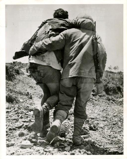 Un soldato americano, ferito durante la battaglia di Okinawa, viene portato in spalla da un commilitone per raggiungere le retrovie americane.