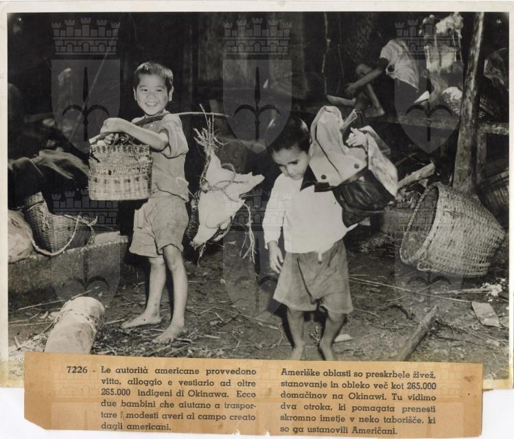 Due bambini di Okinawa aiutano a trasportare gli averi di famiglia dal loro villaggio ai campi americani.