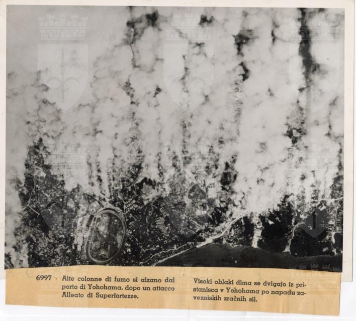 Veduta aerea di un attacco delle superfortezze americane sulla città di Yokohama.