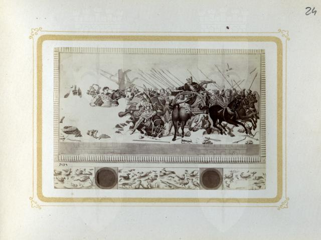 Mosaico trovato nella casa del fauno di Pompei il 24 ottobre 1831 riproducente la battaglia di Isso compiuta da Alessandro Magno contro Dario III di Persia, copia del dipinto del pittore greco Filosseno di Eretria. Nel settembre 1843 il mosaico fu trasferito a Napoli.