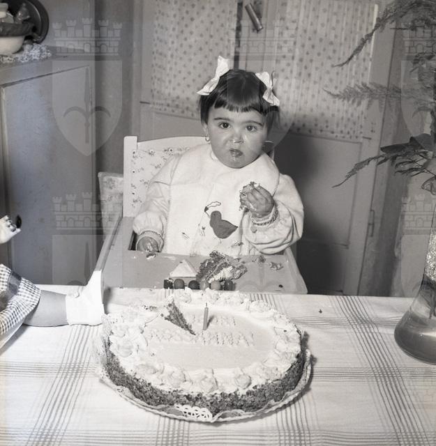 La bambina, che compie un anno, è seduta sul seggiolone: ha due fiocchetti sui capelli e porta gli orecchini.Sul tavolo sono disposti da sinistra a destra: una bambola, la torta con la candelina e un'anatra di peluche.