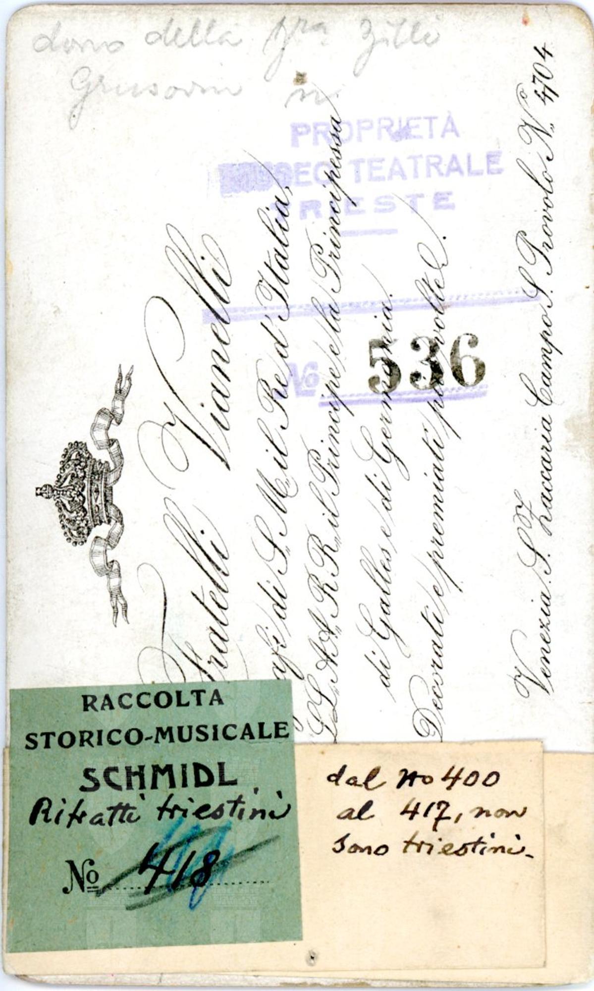 Proprietà Ente pubblico territoriale; Civico museo teatrale C. Schmidl; donazione; Zilli Grusovin, Ersilia; 1918