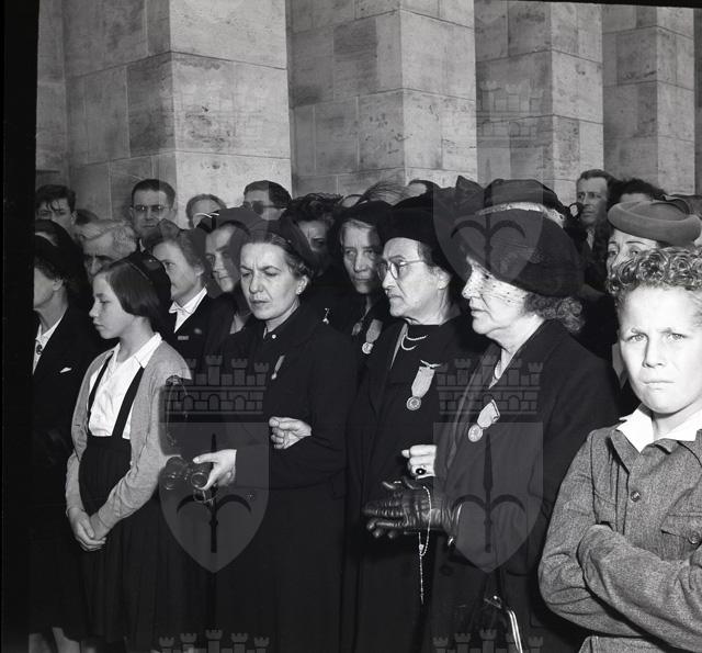 Folla presenzia alla cerimonia di inaugurazione dell'Ara Pacis Mundi di Medea. Cartellone sul muro di una casa: Sottocentro fecondazione artificiale. Uomo al volante di un'automobile