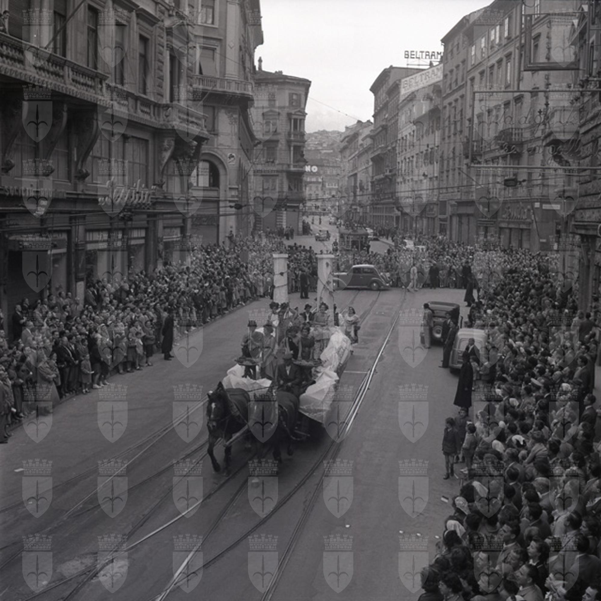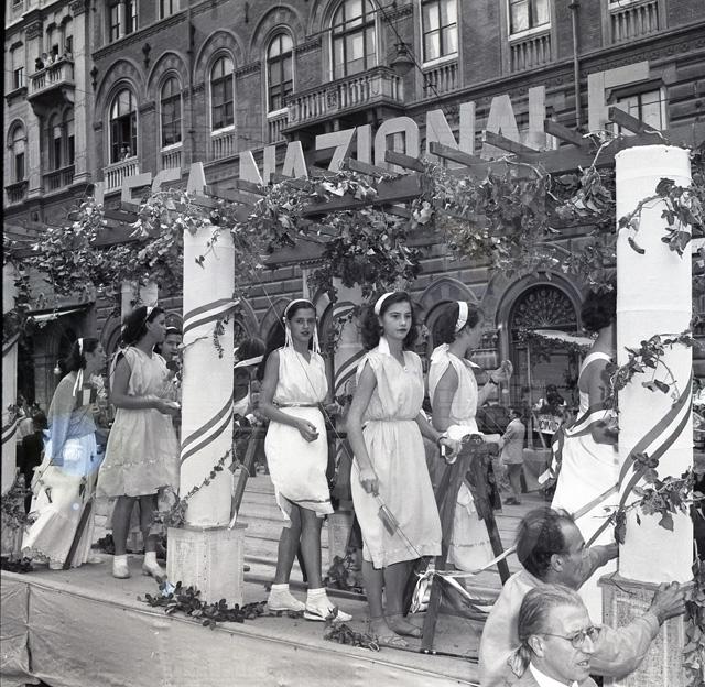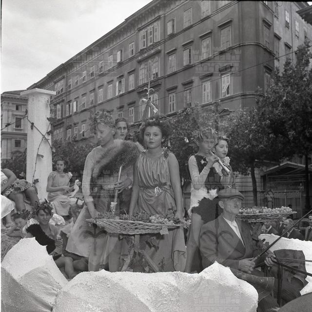 Sfilata di carri allegorici per le vie del centro; Ketty Burba, Miss Trieste 1951, in posa accanto ai grappoli; festa al castello di San Giusto.