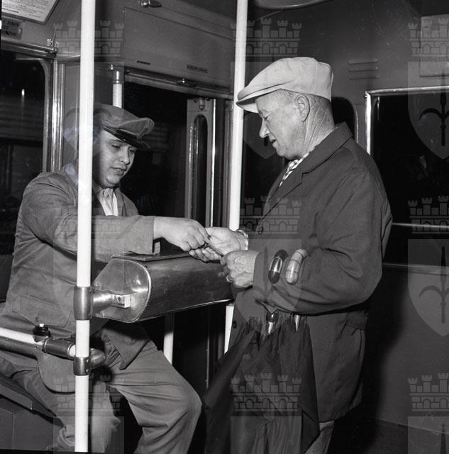 La foto è pubblicata su Il Piccolo del 26 settembre che ci informa che il primo viaggiatore è un giardiniere, Riccardo Furlan, armato di due ombrelli. Il bigliettaio è Gaetano d'Accolti.