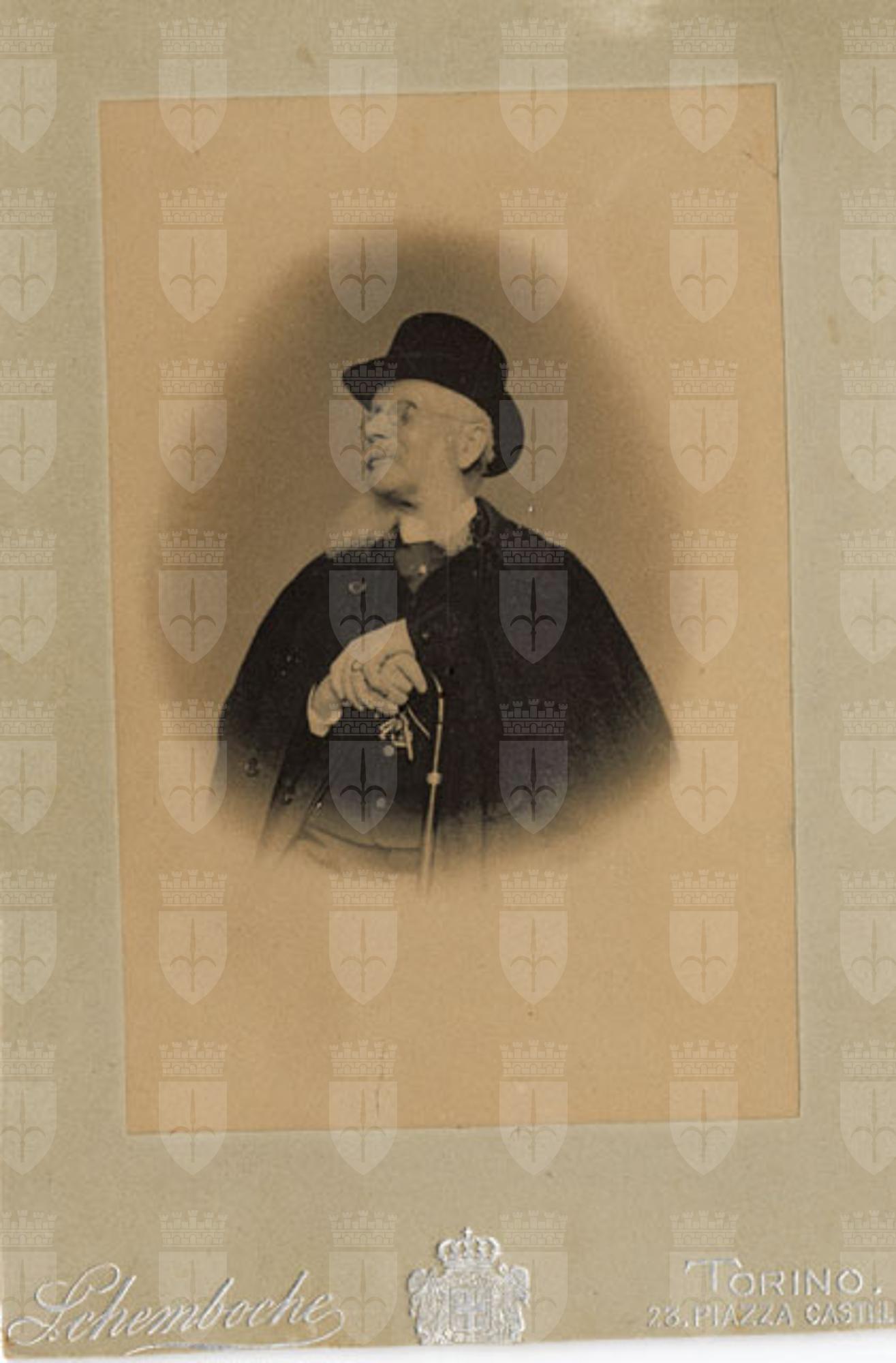 L'anziano barone è ripreso di profilo con bastone e cappello a cilindro. Nelle mani incrociate impugna un mazzo di chiavi.