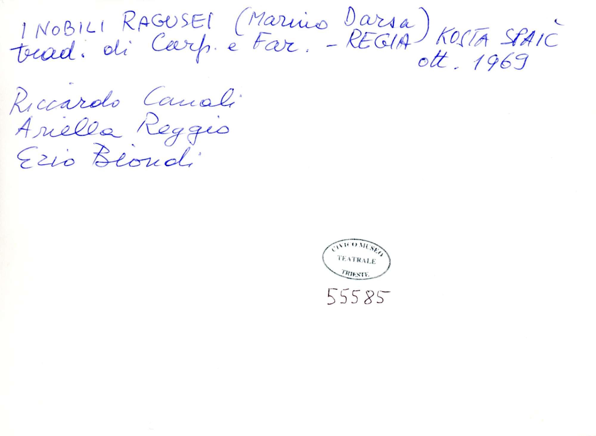 I nobili ragusei, di Marino Darsa, versione italiana di Lino Carpinteri e Mariano Faraguna, regia di Kosta Spaic, rappresentato al Politeama Rossetti dal 8 al 26 ottobre 1969