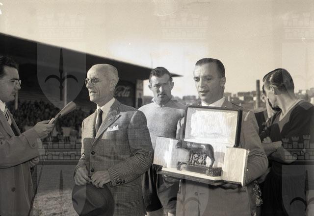 La squadra romana consegna la lupa in bronzo con una targa sulla quale sono espressi i sentimenti degli sportivi romani auspicando il prossimo ricongiungimento di Trieste all'Italia. Testo tratto dal Giornale di Trieste, 1.11.1953