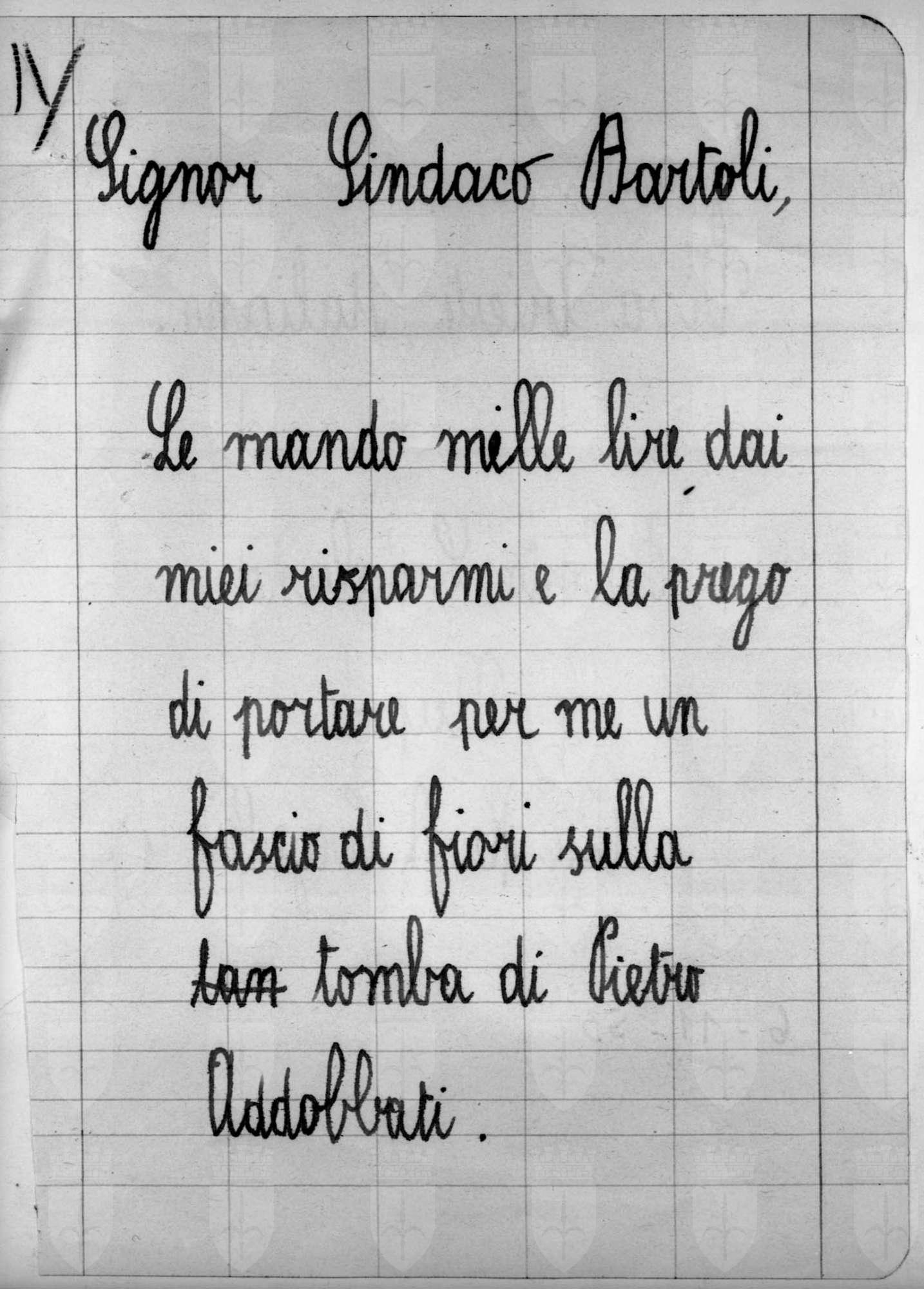 Lettera di un bambino che chiede al sindaco Gianni Bartoli di portare un mazzo di fiori sulla tomba di Pierino Addobbati