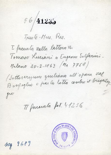 Riproduzione della lettare di Tomaso Luciani a Eugenio Solferini per la sottoscrizione della lotta contro il brigantaggio