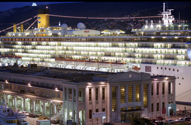 Stazione marittima, nave crociera, Costa Atlantica, rive di Trieste, notturni, pescheria, foto artistiche, turisti, piazza Unità notturni, rive.