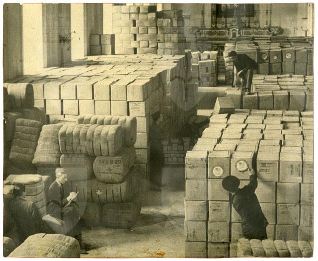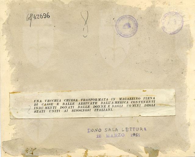 UNA VECCHIA CHIESA TRASFORMATA IN MAGAZZINO PIENA DI CASSE E BALLE ARRIVATE DALL'AMERICA CONTENENTI INDUMENTI DONATI DALLE DONNE E DAGLI UOMINI DEGLI STATI UNITI AI BISOGNOSI ITALIANI.