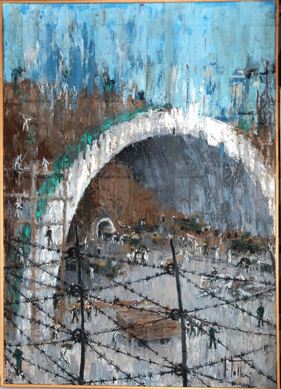 Giovanni Talleri fu prigioniero tra il 1944 e il 1945 a Mühldorf, un campo di concentramento, sottocampo di Dachau, in Germania. Ricordano questa durissima esperienza alcuni disegni, tracciati al ritorno a Trieste, e una serie di dipinti, tra cui questo in esame, che in particolare fa parte di una serie di acrilici della fine degli anni Ottanta del Novecento e raffigura i lavori di costruzione della galleria sotterranea di Mühldorf. Sul retro la tela presenta l'iscrizione “Mühldorf 1944” (in alto), “106” (al centro), ci sono poi timbro e firma dell'autore (in basso a destra).